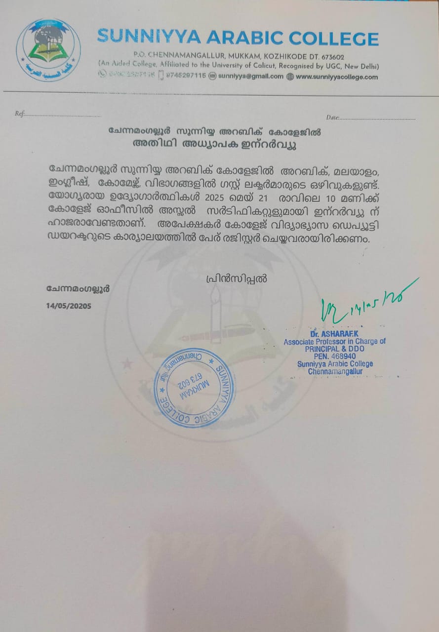 Sunniyya Arabic College is situated at Chennamangallur village located in Kozhikode district. It was established in 1980 and got affiliation in 1995. The college has a congenial atmosphere for academic pursuint and aims at providing education to the local people. The village Chennamangallur, which is situated 25kms East of the district head quarters, has a dense population of minority community.